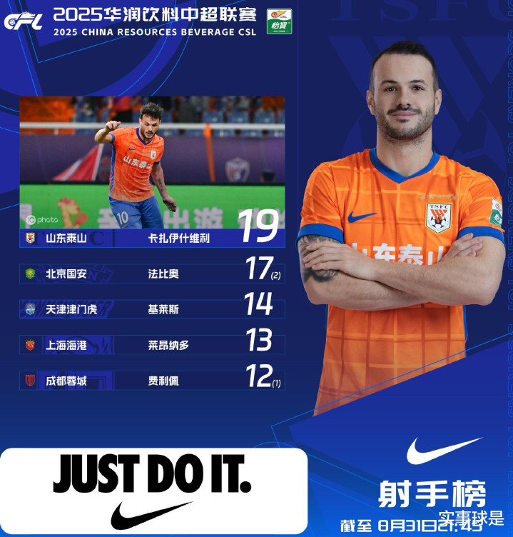 9月1日,中超官方公布了2025赛季中超联赛最新射手榜,共有5名球员登榜,分别是:山东泰山卡扎伊什维利(瓦科)、北京国安法比奥、天津津门虎基莱斯、上海海港莱昂纳多、成都蓉城费利佩。